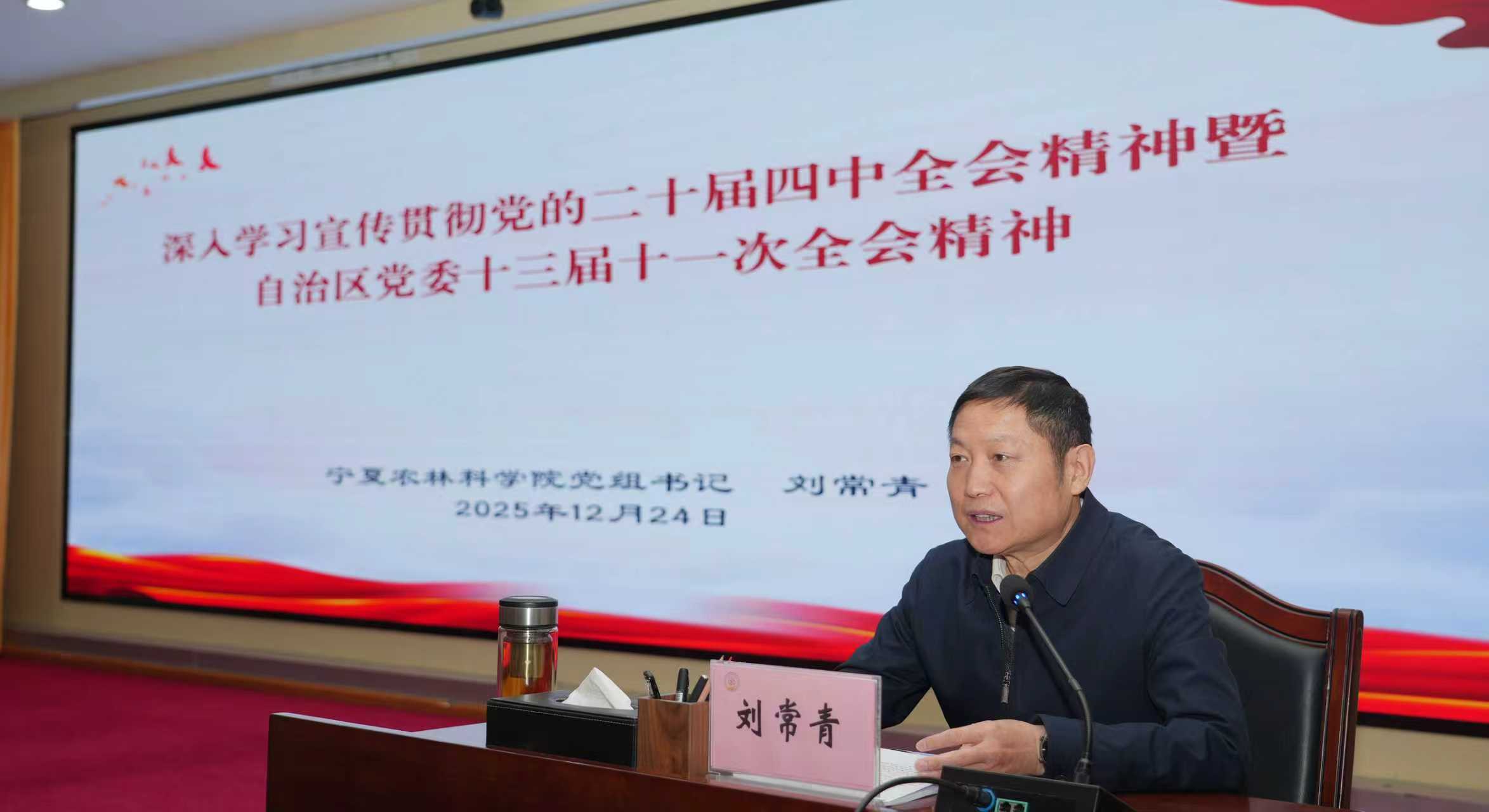 12月24日至26日,e77乐彩举办深入学习贯彻党的二十届四中全会精神暨自治区党委十三届十一次全会精神读书班,深入学习领会党中央和自治区党委对“十五五”时期经济社会发展作出的战略部署和系统谋划,把智慧和力量凝聚到落实好全会确定的各项任务上来,着力提升科技创新能力,推动农林科研事业高质量发展。院党组书记刘常青作开班动员并宣讲辅导,院党组副书记、院长常学文作总结讲话。